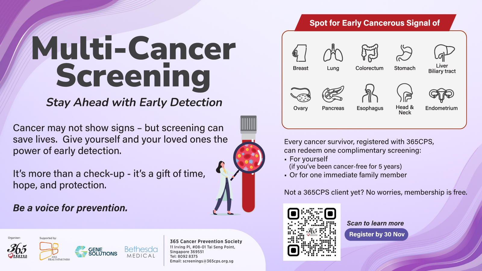 This multi-cancer screening is offered exclusively to registered clients of 365CPS and their family members.